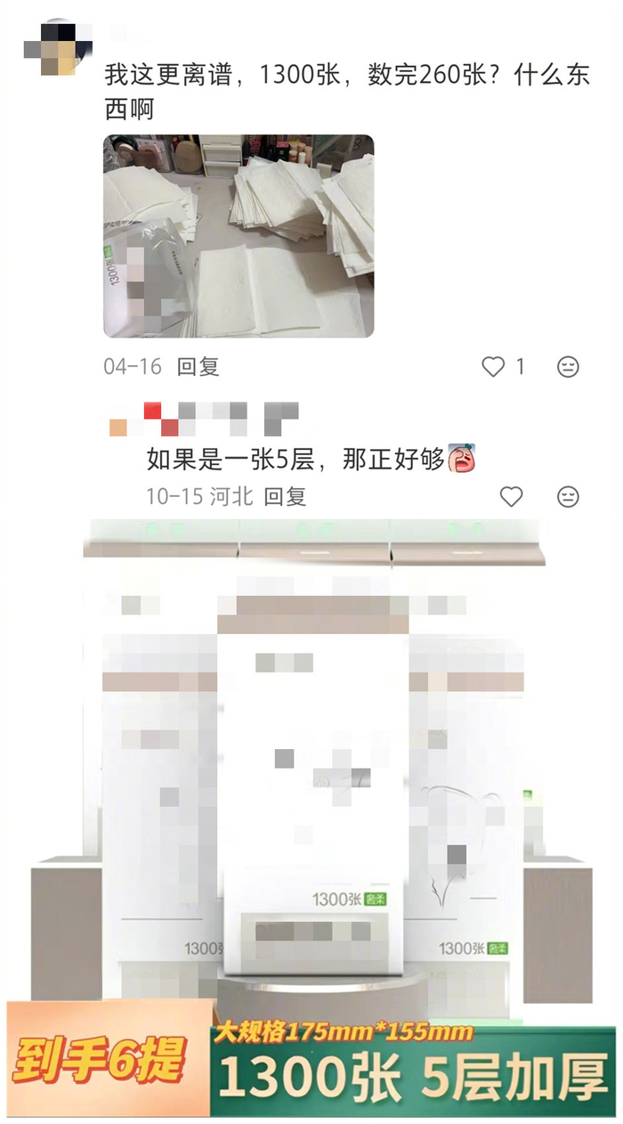 还有人称购买“1300张”抽纸,实践只要260抽,商家解说称“每抽有5层,5×260=1300张”。