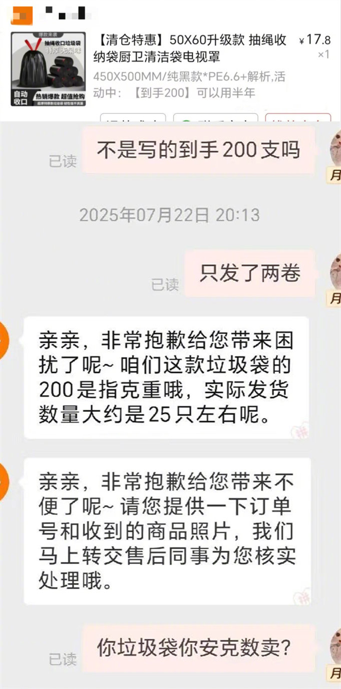 “我其时是为了凑满减才买的,没想到数量差这么多。”张女士联络店肆客服后,客服表明需求录开箱视频来自证。张女士愤慨地表明:“我们哪有那个精力去从拆快递就开端录视频,然后一张张数垃圾袋?我这回是显着货不对板才要求售后的。可想而知,垃圾袋这样的产品水有多深!”