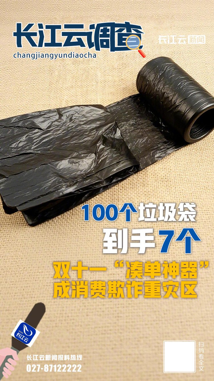 “分明写着一卷有100个垃圾袋,到手一卷才7个,卖家也过分分了!”近来,家住武汉的张女士向长江云新闻()反映,她在“双十一”期间为凑单网购的垃圾袋,实践数量与挂彩严峻不符。